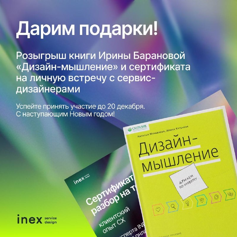 INEX Service Design дарит подарки🎄 Новый год мчится к нам на серебряных санях, а мы спешим к вам с мешком подарков💛 В этом году мы затеяли розыгрыш! Счастливчики получат в подарок книгу Ирины Барановой «Дизайн-мышление. Думаем по-новому» и сертификат на личную встречу с современными волшебниками — сервис-дизайнерами. Именно они превращают обычный сервис в магию. ➡️ Для участия в розыгрыше напишите в комментариях: что для вас означает сервис-дизайн? 🔍Не ограничивайте себя: нам важно ваше понимание и ощущение методологии. Короткое предложение, неочевидная метафора, пару слов? Выбор за вами! 🔍Случайному победителю мы отправим книгу в канун Нового года. А тому, кто отличится креативностью и неожиданной мудростью, наши эксперты лично назначат онлайн-встречу в новом году! На встрече-консультации обсудим сервис в любом его проявлении: улучшение опыта клиентов, новая сервисная стратегия для сотрудников, внедрение сервисных привычек в повседневность или будущее посвящение вас в сервис