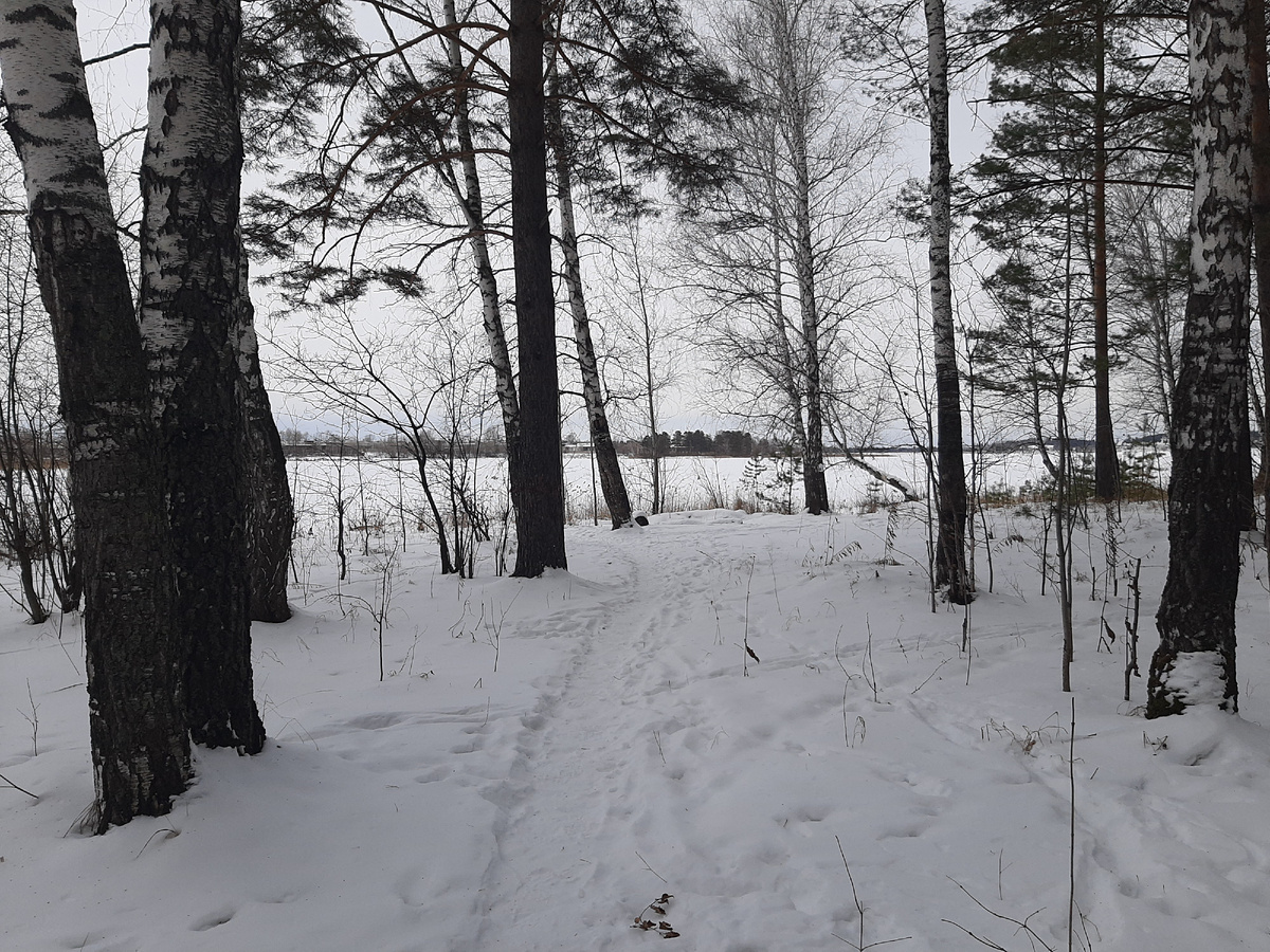 Конечно, хотелось бы открыть лыжный сезон в такой день, чтобы можно было воскликнуть: "Мороз и солнце!" Но так не получится. Впереди еще восемь пасмурных дней, и только в воскресенье 21 декабря синоптики обещают солнце. И мороз -17 С. Так что смело восклицаем: "День чудесный!", радуемся, что сегодня всего лишь -5 С, берем лыжи, палки и... Да, пасмурно. Да, фотографии будут бело-серо-черные. Но впереди нас ждет озеро, а на нем - лыжня. Речь идет о городе Железногорске Красноярского края. Я здесь живу. Лыжня выглядит не очень убедительно. Ветер заносит ее снегом и такое ощущение, что сегодня по ней прошел только один человек. Этакий Отважный лыжник#1. Тогда я буду Отважным лыжником #2. Тоже весьма почетное звание. Лыжня идет вдоль берега озера и повторяет его изгибы. Что-то никого не видно ни впереди, ни позади меня. Неужели я одна на лыжне? Не может быть. Вот поверну за мыс, там наверняка полно пенсионеров - любителей лыжных прогулок. Остальные любители лыжных прогулок на работе,