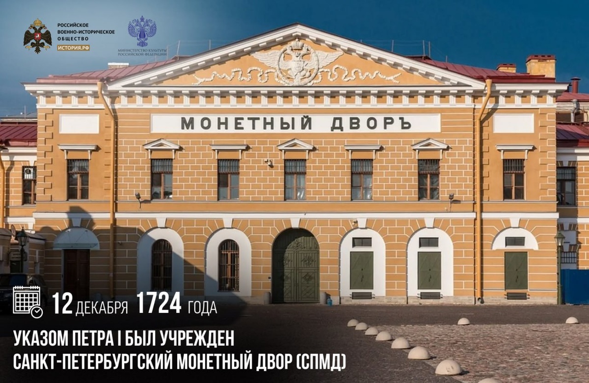 12 декабря 1724 года указом Петра I был учрежден Санкт-Петербургский монетный двор (СПМД)