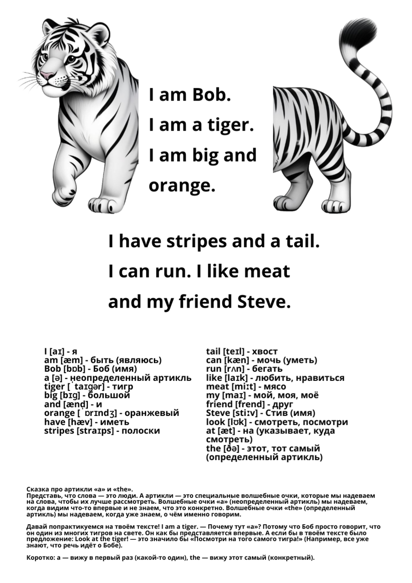 Как научить ребенка читать на английском без страха и словаря? Рассказываю про метод «перевод над строкой» и дарю 3 первые истории: про тигра Боба и кролика Мика. Скачивайте и пробуйте сегодня. Есть момент, который убивает интерес к английскому у большинства детей. Это не грамматика. Это — первая страница текста, сплошь усеянная незнакомыми словами. Ребёнок видит эту «стену» и его мозг кричит: «Стоп! Я не справлюсь». А постоянные поиски в словаре превращают чтение в пытку. Мой сын упирался именно так. «Мама, я ничего не понимаю», — говорил он, отодвигая книжку. И я его понимала. Пока не придумала одну простую вещь, которая перевернула всё. Я распечатала простой текст про мышонка. И предложила сыну не читать, а подписать перевод карандашом прямо над каждым английским словом, совсем полностью над каждым, даже "и", "есть", "это". Первое предложение вышло криво, дальше лучше. Сначала он неуверенно по одному слову собирал короткие предложения, забывая в середине смысл озвученного. Потом —