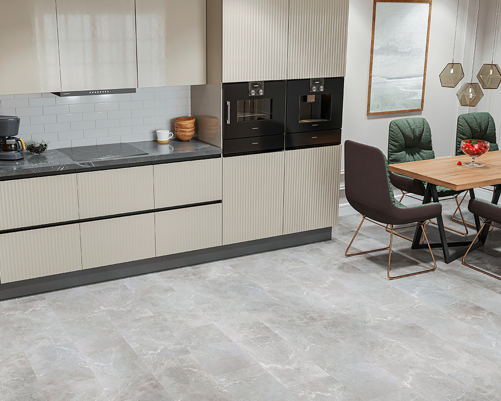 Кварцвинил - инновационное напольное покрытие, основным компонентом которого является меловой порошок в комбинации с полимерами. Этот материал привлекателен тем, что совершенно не боится воды (однако под полотно вода затекать не должна - пойдет плесень). Также кварцвинил имеет более пластичную поверхность по сравнению с ламинатом и поэтому менее звонкий при соприкосновении с твердыми предметами. Ассортимент кварцвинила постоянно расширяется, и мы рады представить нашим читателям несколько замечательных и недорогих новинок от российского завода Alta Step, коллекция Roca. Здесь Вы найдете целый ряд уникальных декоров, имитирующих редкие минералы: это настоящая находка отечественных дизайнеров. Покрытие маркировано 34 классом и прослужит в жилом помещении не менее 25 лет, его толщина 4,3 мм, поверхность структурная, антискользящая. Палладий SPC1908 - "редкозём" в Вашей квартире. Художники Alta Step сумели разглядеть его исключительную красоту и воспроизвели в декоре напольного покрытия.
