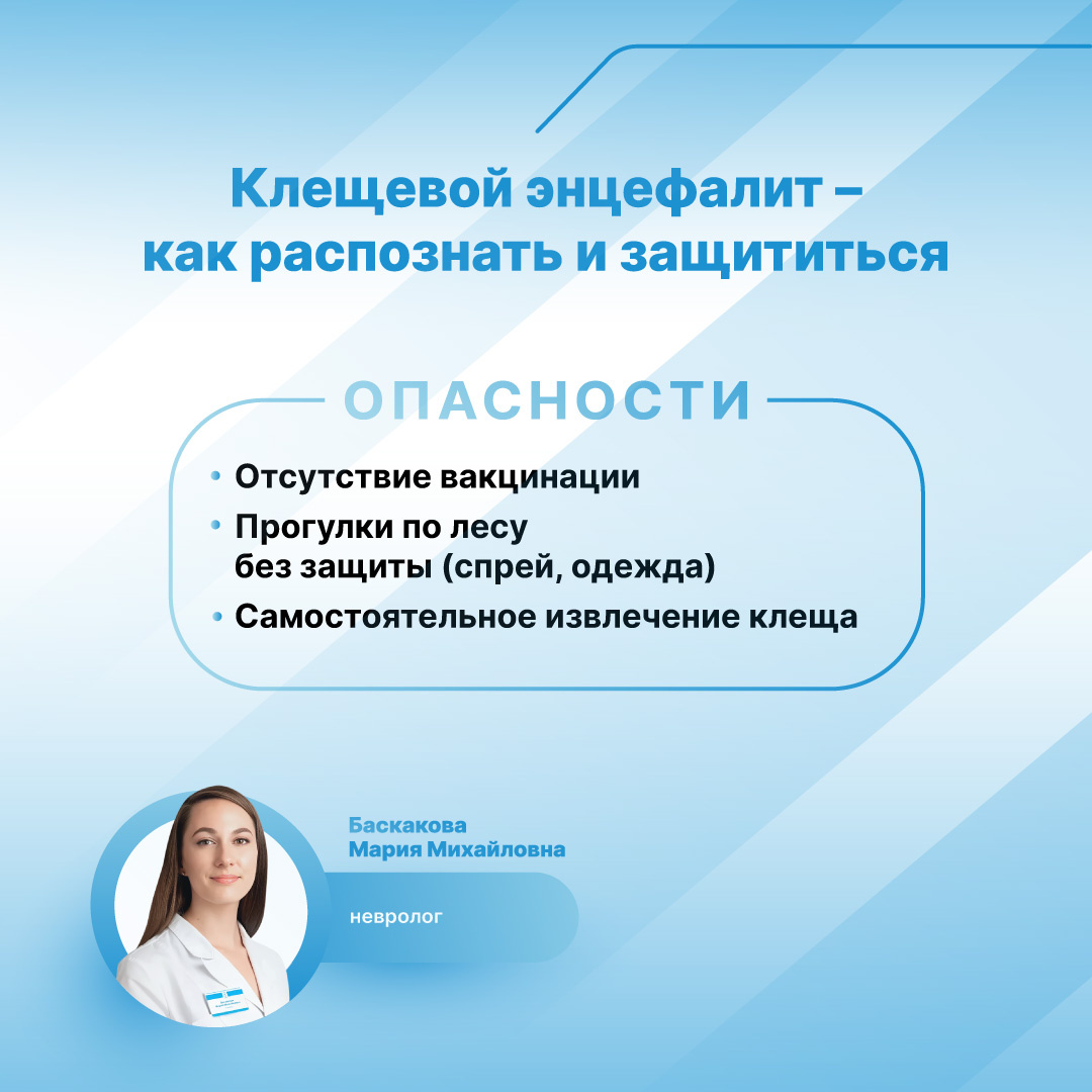 Мария Баскакова, врач-невролог ОН КЛИНИК, рассказала в блоге Ренессанс страхование о том, как распознать симптомы серьезного заболевания после укуса клеща. Клещевой энцефалит – серьезная инфекция, чреватая тяжелыми последствиями, вплоть до инвалидности и летального исхода. Вместе с неврологом Марией Михайловной Баскаковой рассмотрим проявления этого заболевания и способы защиты от него. Заражение происходит главным образом через укус иксодового клеща. Вирус присутствует в слюне паразита и передается его потомству, что приводит к формированию целых популяций зараженных клещей в эндемичных регионах. Передача вируса начинается в первые минуты после укуса. Клещ вводит слюну, содержащую антикоагулянт, препятствующий свертыванию крови. Чем дольше клещ питается кровью, тем больше вируса попадает в организм человека. Риск инфицирования возрастает при неправильном удалении клеща, когда содержимое его желудка попадает в кровь, особенно при самостоятельных попытках извлечения. Следовательно, е