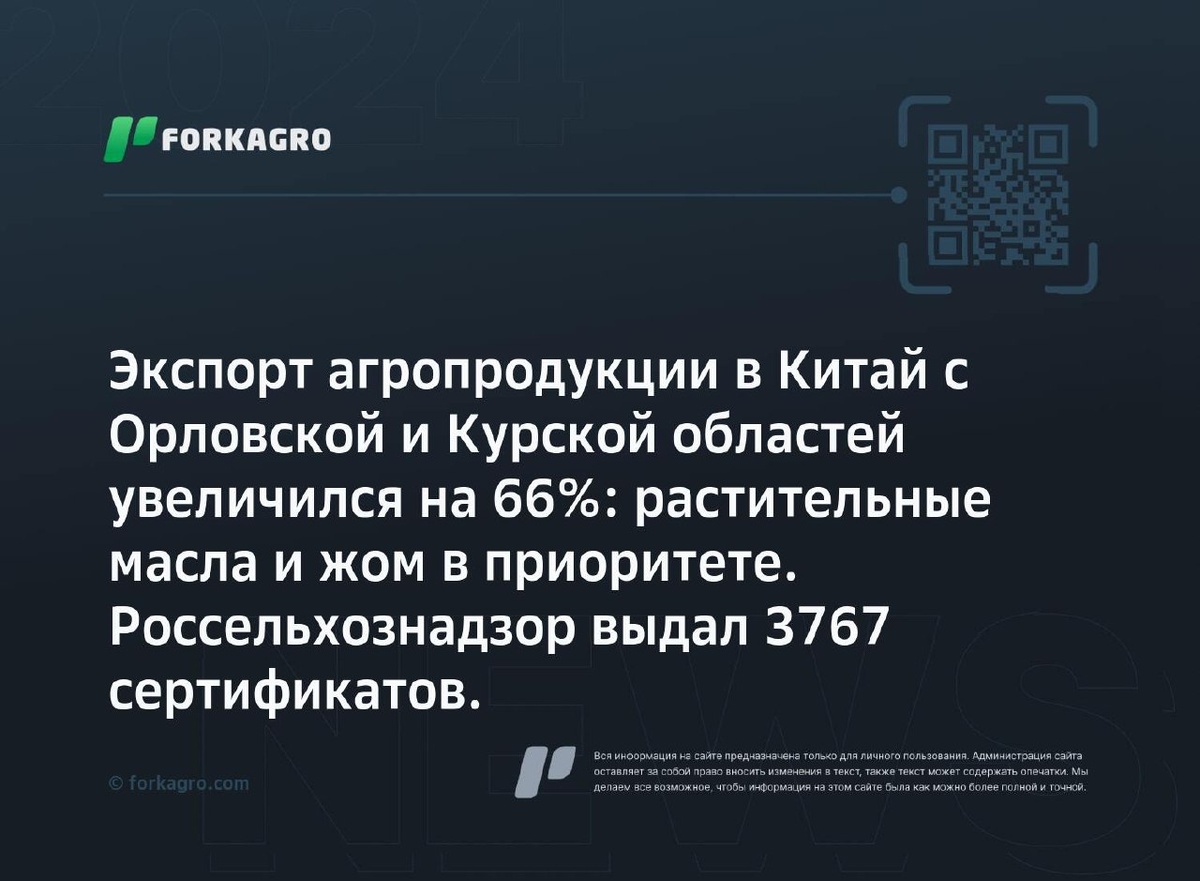 Экспорт агропродукции в Китай с Орловской и Курской областей увеличился на 66%: растительные масла и жом в приоритете. Россельхознадзор выдал 3767 сертификатов. С Россельхознадзором строже контролируют экспорт в Китай из Орловской и Курской областей: за 2025 год увеличилось количество поставляемой в Небесную Империю подкарантинной продукции на 66%, достигнув 157,3 тыс. тонн. В основном это растительные масла — 133,5 тыс. тонн. Отправлено также жома свекловичного и зернопродукции. Россельхознадзор выдал 3767 сертификатов на экспортную продукцию. Перейти к источнику