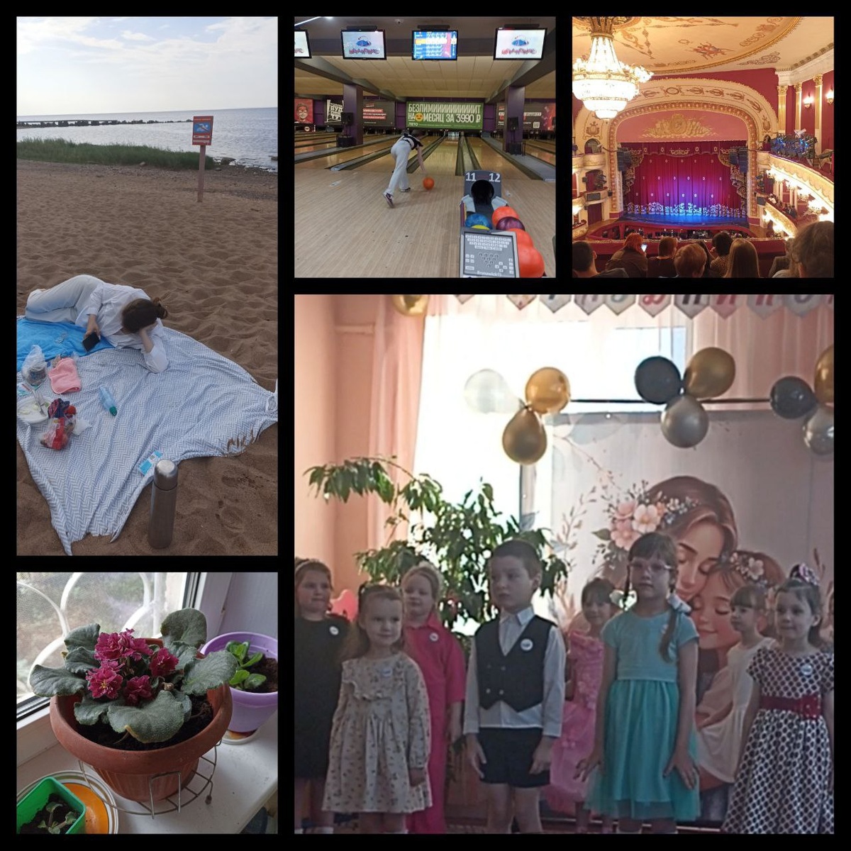 Задание 6 Тихие победы. ( 5 достижений этого года) : Итак : 1) Съездила с дочкой в Сестрорецк, на пляж. 2) Впервые в жизни посетила боулинг! 3) Сходила на оперу " Мистер Икс " Кальмана. 4) Завела цветок ( давно хотела именно фиалку). 5) Сходила к племяннику на утренник, на день матери. Вот такие приятные воспоминания подкреплённые фото. #побег_от_оливье #Лисс_тая_моб #челлендж