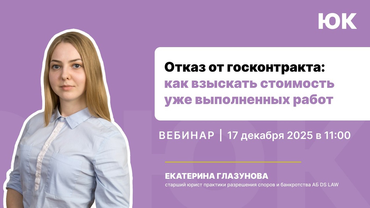 Спешим с анонсом вебинара на тему: «Отказ от госконтракта: как взыскать стоимость уже выполненных работ» 📅 Когда: 17 декабря 2025 в 11:00 по мск. Участие бесплатное, регистрация здесь. 🎙 Спикер: Екатерина Глазунова , старший юрист практики разрешения споров и банкротства АБ DS LAW. Разберем, как грамотно отказаться от госконтракта и взыскать оплату за выполненные работы. Поделимся выводами из судебной практики и дадим практические рекомендации. ➡️ Регистрируйтесь по ссылке, чтобы подключиться к прямому эфиру и после вебинара получить запись. 🟣 Подписаться на канал «Юрист компании»