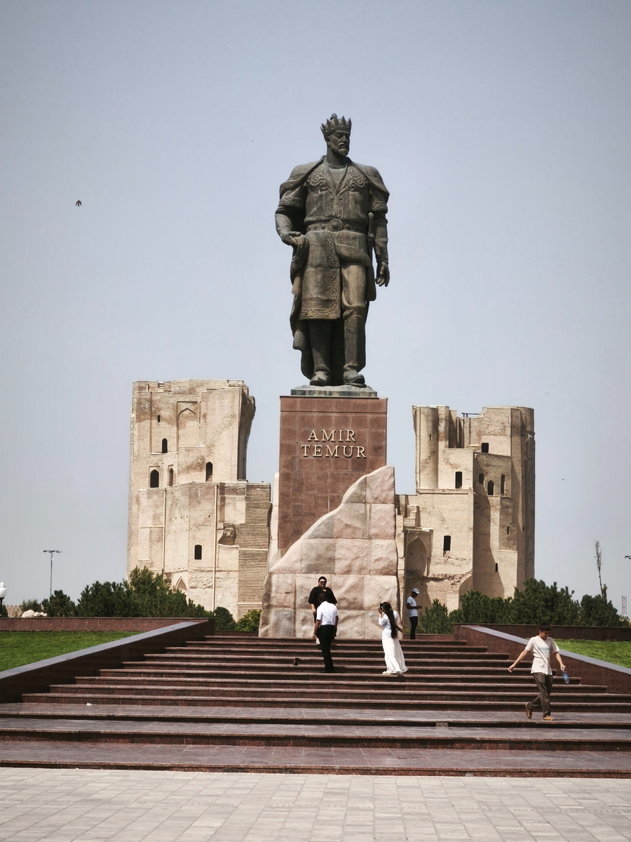 Внушительный памятник Темуру (Тамерлану) на фоне остатков его дворца Аксарая Территория исторического центра довольно большая. Конечно, много сувенирных лавок, но было одно место с очень красивыми картинами. Артгалерея - выставлены картины разных современных художников. Очень красивые! В том числе картины художника Азиза Ахмедова. Но Азиз Ахмедов ещё и реставратор и историк искусства.
