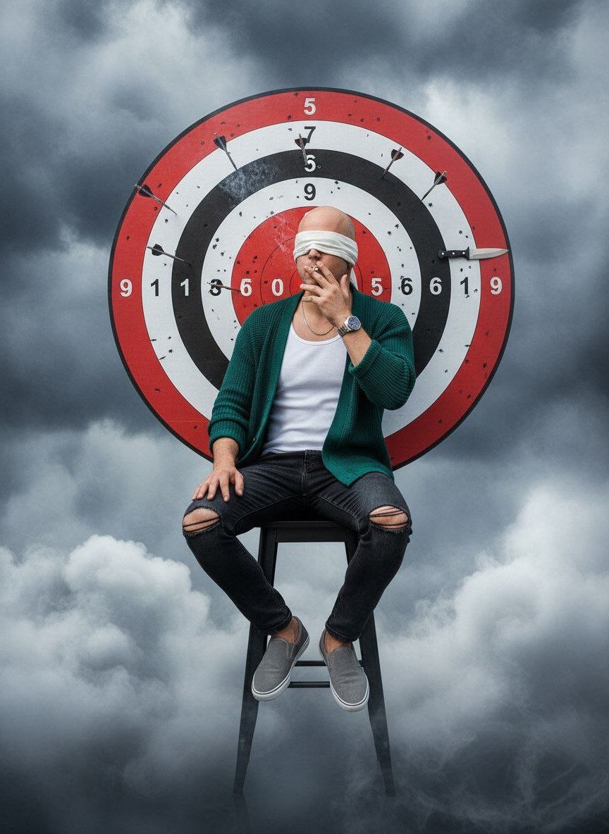 Гиперреалистичный кинематографический вертикальный снимок стильного молодого человека, небрежно сидящего на черном табурете. Используйте предоставленное эталонное лицо: поменяйте его местами с моим лицом, соблюдая 100% точность. У мужчины завязаны глаза полоской белой ткани, а правой рукой он прижимает к губам сигарету. На нем открытый вязаный кардиган бирюзово-зеленого цвета, белая майка в рубчик (жилет), угольно-черные рваные джинсы с прорехами на коленях и серые слипоны. на запястье модные часы. За его спиной находится массивная, графичная красно-белая мишень "яблочко". В мишень, окружающую его, встроено несколько металлических стрел и метательных ножей. Фон очень эффектный, он заполнен серыми грозовыми облаками и клубящимся белым дымом/туманом. Высокая контрастность, четкая фокусировка, разрешение 8k Промт и боты Nano Banana👇👇👇 https://t.me/nanobanana_promt/23 https://dzen.ru/nanobanana_promt