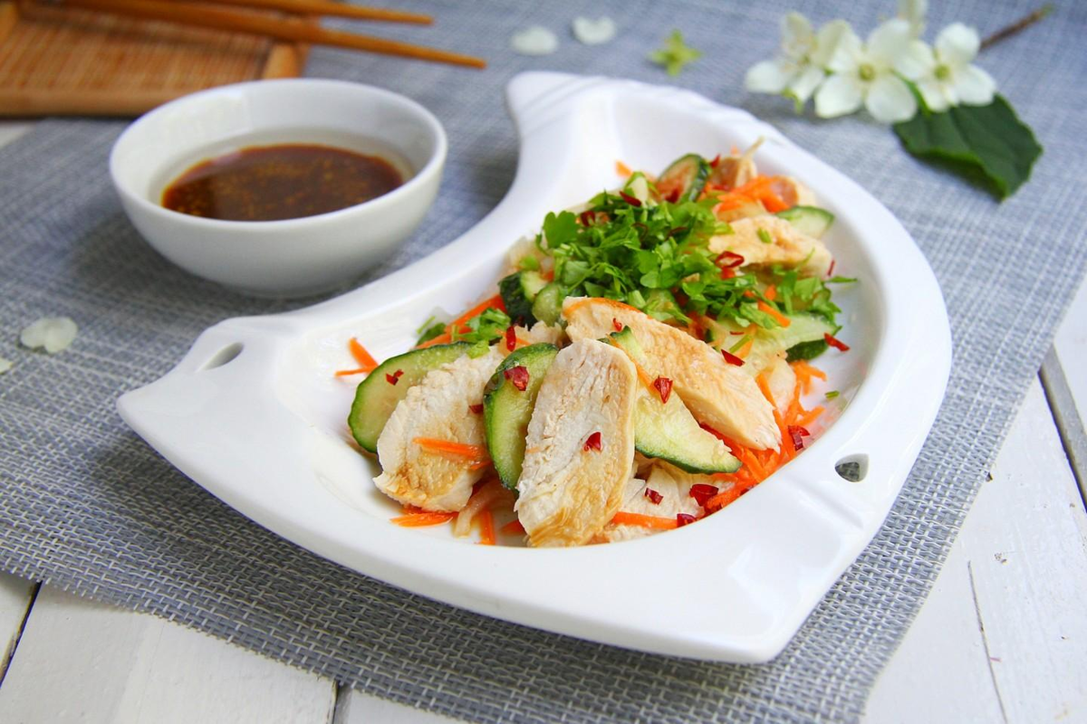 Сочетание продуктов в этом салате классическое, но технология приготовления несколько иная, чем обычно, поэтому и вкус отличается. Ингредиенты: для курицы: грудка куриная (филе) — 200 г соль — 1 ч. л. лук репчатый — 1/2 шт. чеснок — 1 зуб. перец красный жгучий — 1 шт. перец горошком и лавровый лист Берём куриную грудку, заливаем водой, чтобы жидкость лишь покрыла филе. Добавляем соль, репчатый лук, чеснок, перец красный жгучий + перец горошком и лавровый лист. Доводим до кипения и варим на медленном огне 20 минут, далее достаём курицу, даём ей остыть. нарезаем тонкими ломтиками (слайсами) по желанию можете разобрать на волокна для салата: морковь — 1 шт. покупаем готовую или готовим сами соль — 1 ст. л. морковь и трём на тёрке соломкой - по-корейски. Перетираем морковь с солью. лук репчатый — 1 шт. Добавляем порезанный тонкими полукольцами лук и перетираем с солью. огурец — 1 шт. Кладём порезанный тонкими полукольцами огурец, тоже перетираем с солью. можете нарезать тонкой соломкой М