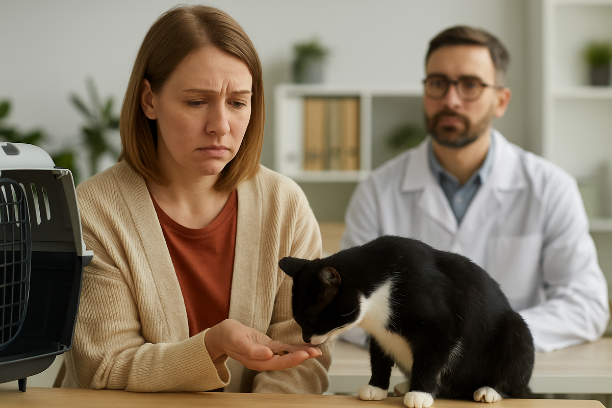 Через месяц она приходит снова. Я, если честно, не ожидал — такие истории часто растворяются в быту. Но вот она, с тем же серым котом, но уже с другим выражением лица.