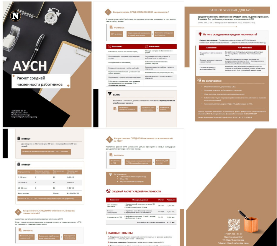 ‼️ Одно из ключевых условий для применения АУСН - средняя численность работников за каждый месяц не должна превышать 5 человек (п. 28 ч. 2 ст. 3 Закона № 17-ФЗ). Ошибка в расчёте, которая привела к превышению лимита = потеря права на АУСН. ✨ Подготовила для вас подробную Памятку по расчету средней численности работников! 📊 Из чего складывается "средняя численность" для АУСН? 1️⃣. Среднесписочная численность (ССЧ) работников по трудовым договорам. 2️⃣. Средняя численность внешних совместителей (тоже по трудовым договорам, но в другой компании). 3️⃣. Средняя численность исполнителей по ГПХ (договоры подряда, оказания услуг), кроме самозанятых (НПД) и ИП. ___________________________ ШАГ 1.