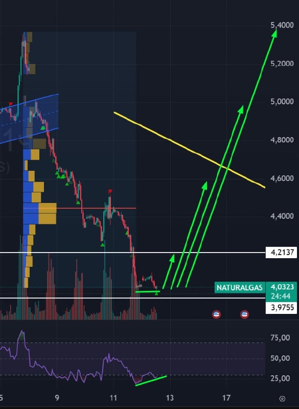 ⛽️ ГАЗ 🟢Оптимистично настроен по газу! Во-первых, пробили вчера важную лини. 4,2137. при ее пробое начались литься МК у лонгустов-котлетчиков. Даже на лонгово-нейтральных запасах газ был под давлением продаж. Во-вторых, по опыту, при тренде газа в 20% он не продолжается дальше, так что жду отскок как минимум к белой пробитой линии для ее теста. Если пойдем выше, то целей наверх полно, вплоть до перехая прошлой пятницы. Да-да, мы были на хаях всего 7 дней назад. Это газ:) 🚗 Капитуляция лонгустов не будет длиться вечно, так что ожидаю в ближайшее время отскок/разворот. Если такое нарисуем, то будет сформирована конвергенция по RSI, которую будем отрабатывать. #Газ #NG1 #американскийгаз #Фьючерсгаза #naturalgas #bogdanoffinvest