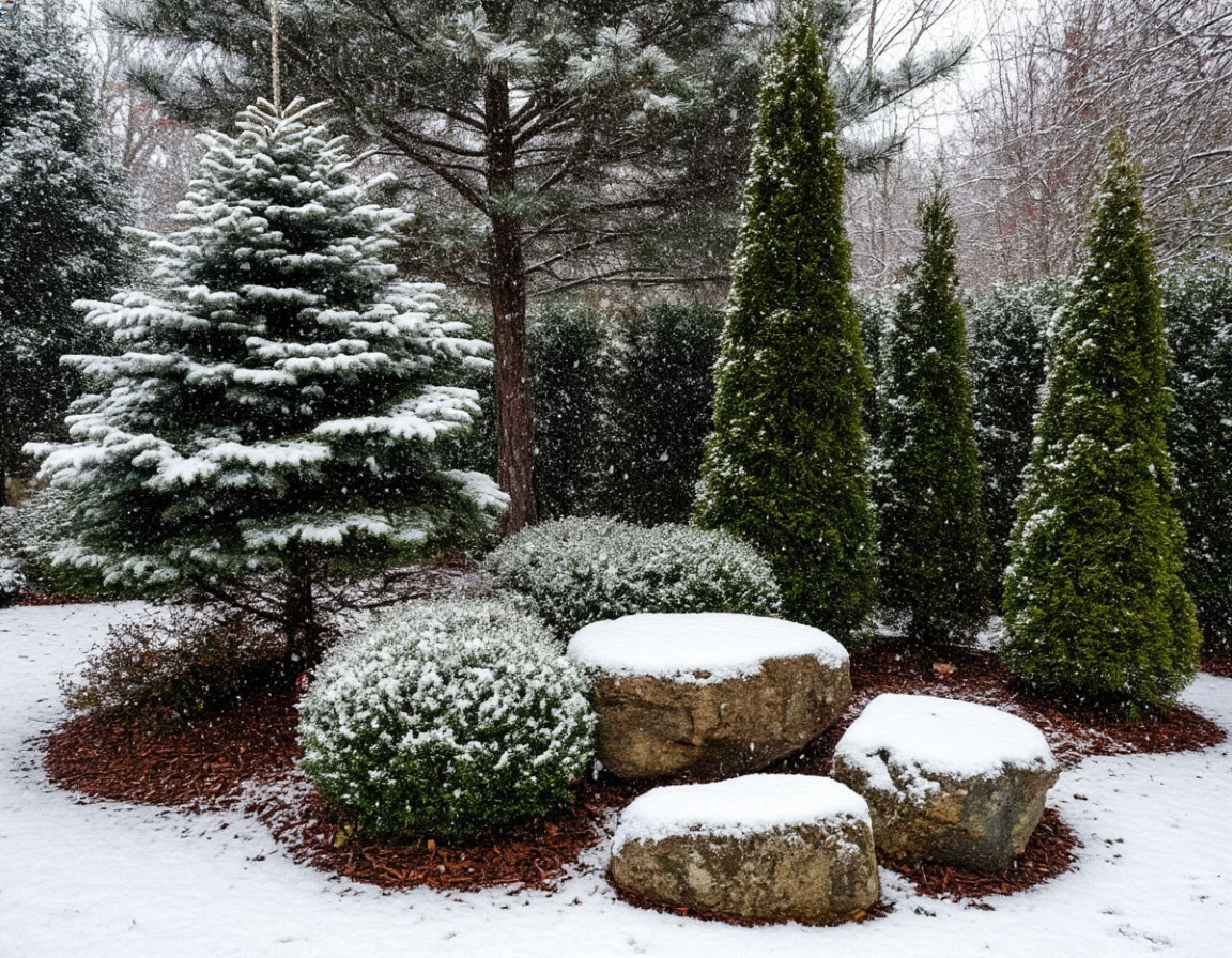 Группа из 3–5 валунов разного размера перед можжевельником или сосной. Снег ложится между камнями, создавая эффект «замёрзшей реки». Стоит недорого, эффект потрясающий.
