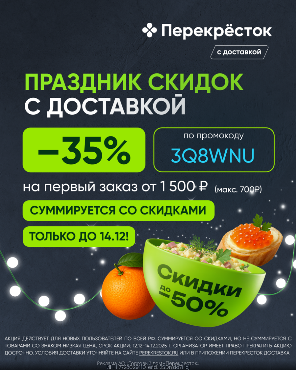 Дополнительная скидка 35% на первый заказ в Перекрёсток Доставка😱 🎁Применяй промокод 👉 3Q8WNU и получай доп.скидку 35% на всю корзину от 1500 ₽ максимальная сумма скидки 700₽ Суммируется со скидками, но не суммируется с товарами с знаком "Низкая цена"🥳 Акция только с 12.12 по 14.12, торопись забрать свою выгоду🤝 Действует для новых пользователей по всей РФ Всем Во Благо 🙏❤️ Ссылка для удобства: https://gtblg.ru/lkDWPo?erid=2SDnjdd7Hcj