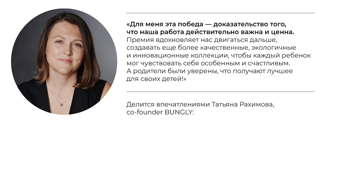 Премию «Золотой медвежонок» считают своеобразным «Оскаром» в мире детских товаров. Получить её – значит доказать, что твой продукт не просто хороший, а один из лучших в стране. И в 2025 году этим «Оскаром» сразу в двух номинациях наградили BUNGLY. В апреле мы взяли награду в категории «Бренд года», а в июне закрепили успех и выиграли сразу три места в номинации «Лучшая детская одежда и школьная форма»: 1 место за коллекцию верхней одежды, 2 место за трикотажную линейку, 3 место за капсулу для малышей от 0 до 2 лет. Честно, для нас это был настоящий вау-момент. И дело даже не в статуэтках, хотя золотой медвежонок теперь украшает наш офис и невероятно похож на нашего фирменного мишку BUNGLY. Это знак доверия от родителей по всей стране. А такое признание вдохновляет куда сильнее любой грамоты! Что такое «Золотой медвежонок» Если кратко, это главный конкурс детских товаров в России, который проводится с 2010 года. Экспертный совет изучает каждую работу с разных сторон: продуманность, п