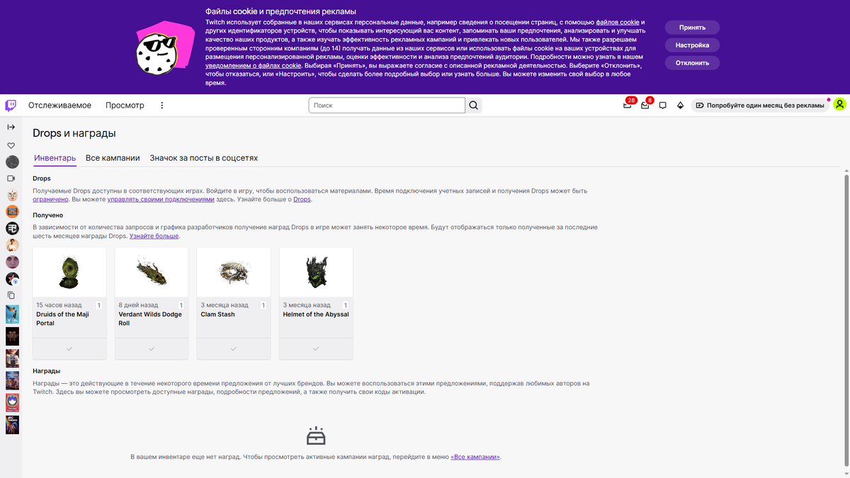 После выполнения условия зайдите в инвентарь Drops на Twitch (Профиль→ Drops и награды).