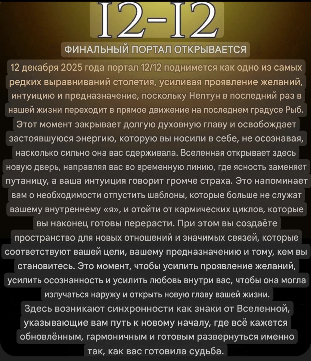 Терри Эндрюс Декабрь полон завершений и начал. По мере того, как мы обретаем способность воплощать в себе больше своей силы, мы вкушаем сладость созидания. Это происходит постоянно: Маленькие вещи, которые делают нас счастливыми, большие вещи, которых мы хотели, которые связывают нас глубже с тем, кто мы есть. И нам снятся сны, где мы находимся на высоких частотах, просто чувствуем их и привыкаем к ним. Мы находимся в растущем потоке, потоке новой энергии, и мы переживаем красоту этого, и видим невероятное влияние на других, которые внезапно понимают, что они не соответствуют тому, чего хотят. Пространство, в котором мы находимся, требует доверия. Мы открываемся любви, вступая на новый путь бытия. Мы удерживаем космический поток сердечного сознания, посеянного внутри нас, и именно этим мы делимся с миром. Мы видим, что происходит благодаря этому: желания обретают форму, а мечты становятся реальностью. Те из нас, кто продвигался по своему пути без понимания со стороны окружающих, т