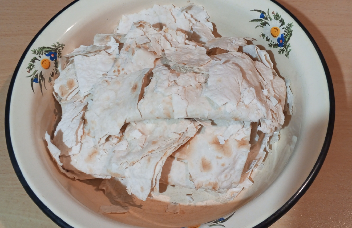 Что вы делаете, когда остается неиспользованный лаваш? Я его замораживаю. И вот, наводя порядок в недрах морозильной камеры, я обнаружила одну целую упаковку лаваша и две начатых, которые уже начали крошиться. Шаурму в такой уже не завернёшь, а выбросить жалко. Выглядел он совсем не презентабельно, как на фото ниже. Дабы не пропал продукт, за который деньги уплачены, будем готовить запеканку с фаршем. Для неё как раз нужен лаваш, порванный кусочками, поэтому наша некондиция вся пойдет в дело. Нам понадобится: Лаваш - 300 гр Яйца - 5 шт Молоко - 1 стакан Сыр твёрдый - 200 гр Фарш - 700 гр Соль, перец - по вкусу Приготовление: Сначала подготовим лаваш. Если он замороженный, слегка размораживаем, но не до конца. Так его будет легче поломать на кусочки. Если лаваш свежий, можно постричь его ножницами. Получаем небольшие кусочки произвольной формы. Все обрывки и обломки используем. Теперь приготовим заливку. Для этого нам понадобится глубокая миска таких размеров, чтобы вместился весь