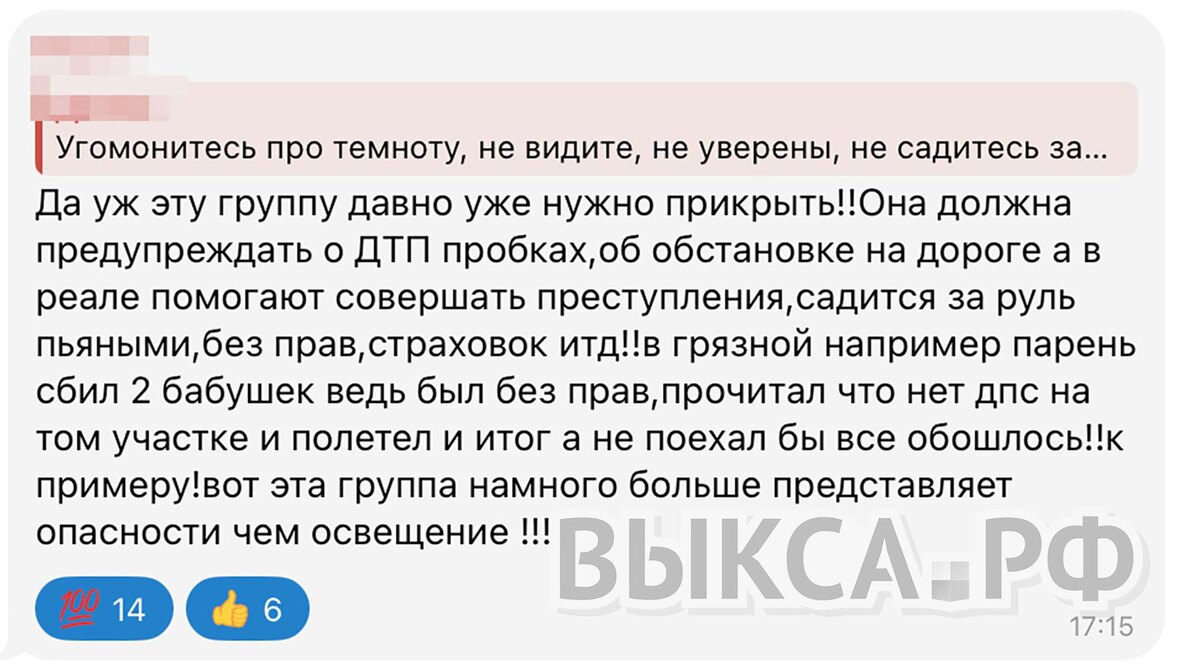 😯 Как выксунцы мешают работе ГИБДД В комментариях под новостями о ДТП выксунцы регулярно высказывают мнение о необходимости закрыть группы, которые предупреждают о расположении постов ГИБДД. «Так и будет у нас в городе продолжаться беспредел на дорогах. И дело не в администрации, ни в фонарях, ни в башне, а в народе невоспитанном. Побольше фотографируйте сотрудников ГИБДД и выкладывайте в местных группах. Штата и так мало у них, так их местоположение постоянно сливают в общий доступ, не давая нормально работать», — прокомментировал данную проблему один из жителей города. Людей возмущает, что вместо того, чтобы способствовать безопасности на дорогах, участники таких чатов, помогают нарушителям уходить от ответственности: «Эти группы давно уже нужно прикрыть! Они должны предупреждать о ДТП, пробках, об обстановке на дороге, а в реальности помогают совершать преступления, садиться за руль пьяными, без прав и страховки.» Критики отмечают, что подобные чаты не формируют у водителей ку