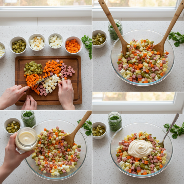 - Заправляйте Оливье непосредственно перед подачей — так он дольше останется свежим.