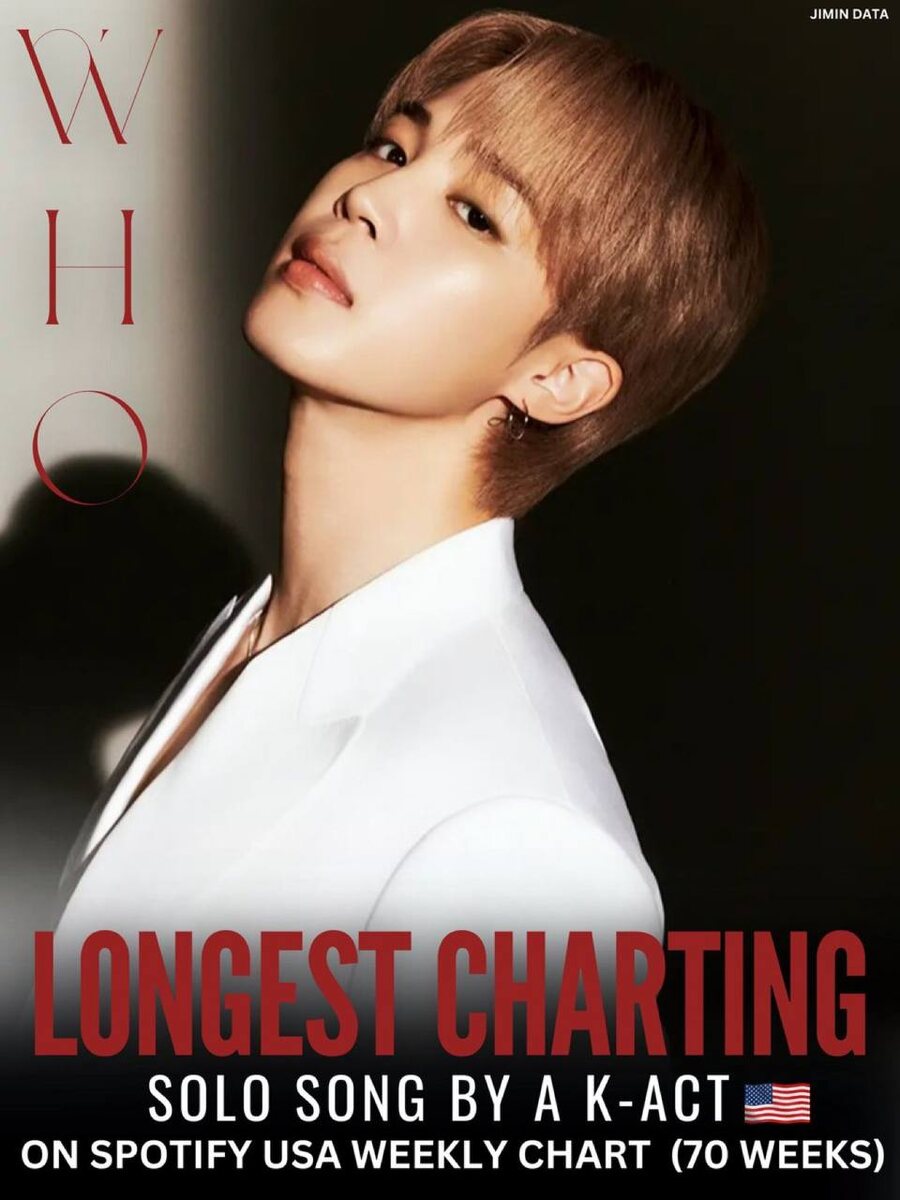 🍒 "Who" Чимина продержалась 70 недель в чарте Spotify USA Weekly. Она стала первой сольной песней корейского исполнителя в истории, а также второй песней корейского исполнителя в принципе, добившейся этого. cr.pjm_data #JIMIN @kumihobts