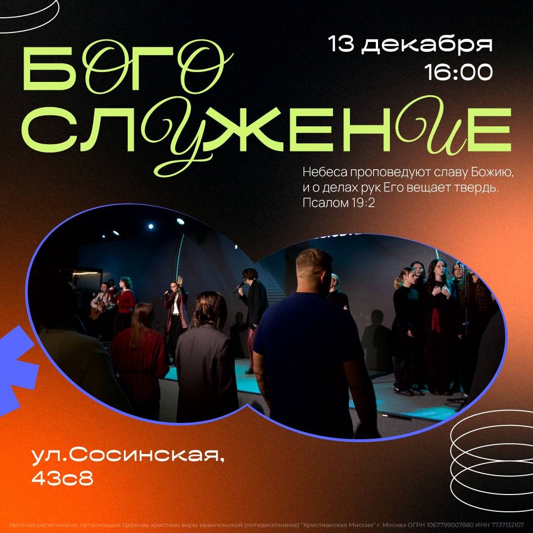 Приглашаем вас на богослужение! 13 декабря / 16:00 / Сосинская, 43с8 «Возрадовался я, когда сказали мне: "пойдём в дом Господень".» - Пс. 121:1 Когда мы собираемся вместе в доме Божьем, Он укрепляет, наполняет и обновляет наши сердца. Пусть это служение станет временем единства, поклонения и живой встречи с Богом. Ждём каждого. 🙏