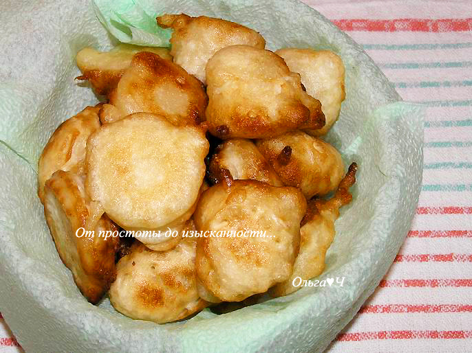 растительное масло для фритюра Приготовление: В теплую воду всыпьте муку. Перемешайте венчиком (тесто должно быть как густая сметана). Добавьте сахар, соль и разрыхлитель. Хорошо перемешайте. Разогрейте растительное масло для фритюра. С помощью 2х ложек выкладывайте тесто в масло, обжарьте до румяности. Выложите на бумажное полотенце, затем подавайте, по желанию посыпав сахарной пудрой. Приятного аппетита! Вам также могут понравиться: