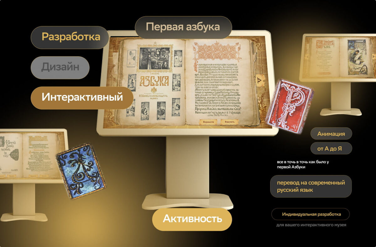 Сенсорные столы и панели открывают новые возможности для интерактивного образования и познавательного развлечения. Один из самых интересных форматов — интерактивные книги, которые превращают классический контент в увлекательный мультимедийный опыт. Проект: "Первая азбука" для Рязанского историко-архитектурного музея-заповедника (РИАМЗ) Концепция Для музея была разработана интерактивная версия старинной азбуки, адаптированная для сенсорного стола. Задача — в игровой форме познакомить детей с историей письменности, старославянской азбукой и музейными экспонатами. Особенности реализации Анимированные буквы — каждая буква "оживает" при касании, показывая: историческое написание (кириллица, глаголица);