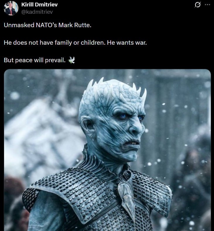 Putin's envoy Dmitriev UNMASKS Mark Rutte 'He does not have family or children. He wants war' Recently Rutte said that the West needs to be ready for what their great-grandparents endured