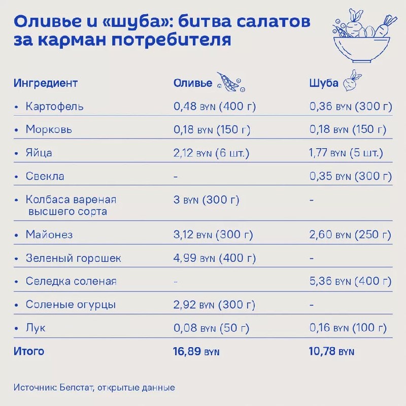 Оливье и "шуба": битва салатов за карман потребителя Sputnik подсчитал, что выгоднее приготовить, если бюджет ограничен. И абсолютным победителем оказалась, как ни странно, селедка под шубой. 🔴 Читайте Sputnik Беларусь в MAX