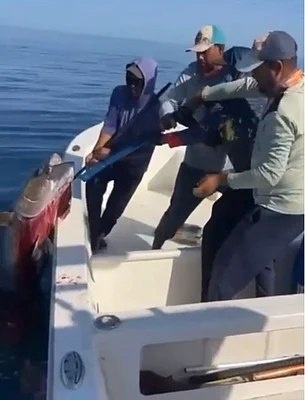 🇦🇪 Смотрите: Рыбаки из ОАЭ выловили огромного тунца весом 137 кг у побережья Фуджейры. Видно, как огромная рыба отчаянно бьется в воде, пытаясь вырваться на свободу, в то время как четверо мужчин пытались поднять ее на лодку — задача, которая потребовала огромных усилий.