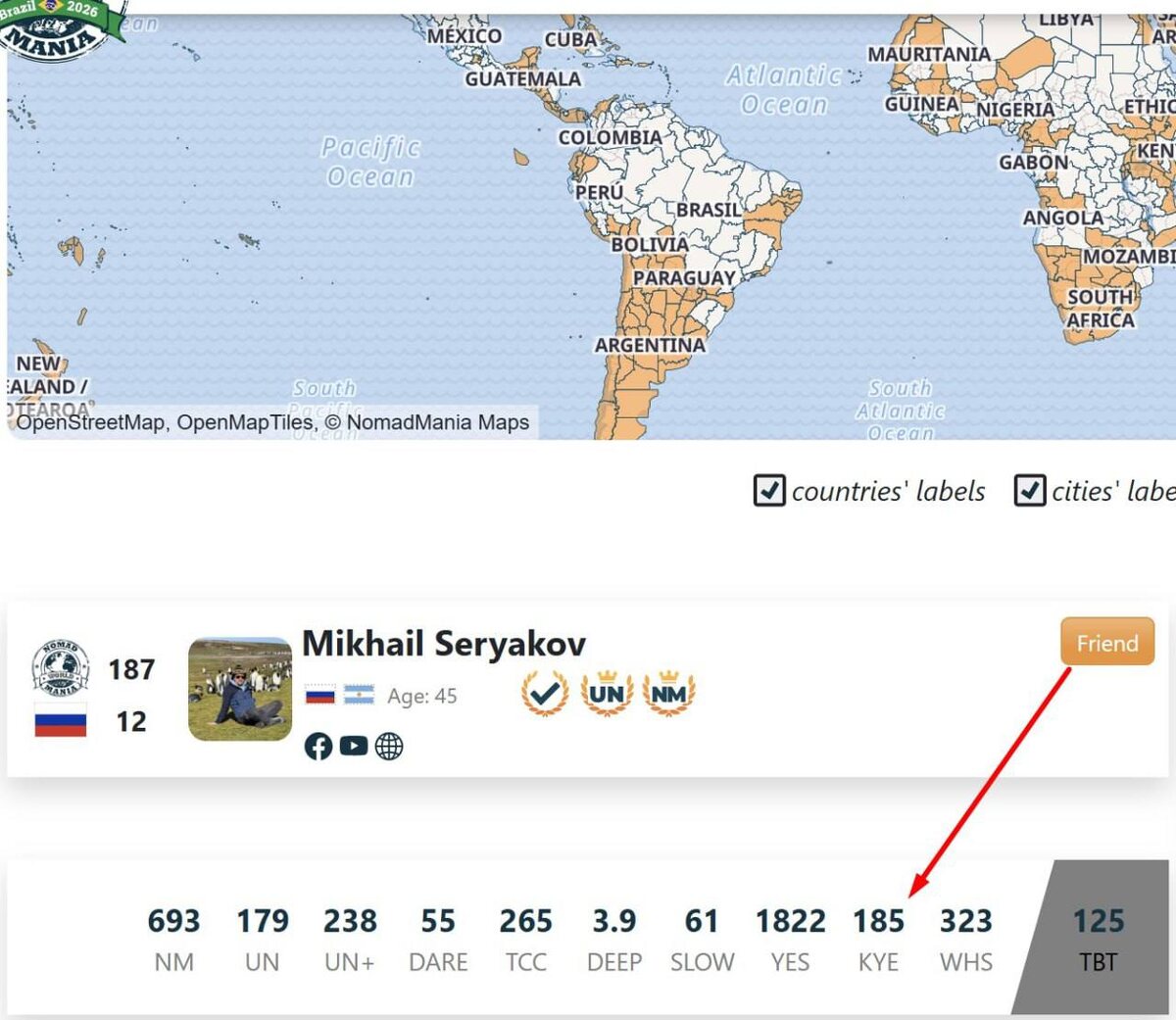 РЕЙТИНГ KNOW YOUR EARTH - ЗНАЙ ЗЕМЛЮ Самый простой рейтинг NomadMania. Дену он очень нравится, а по мне – самый бестолковый. Весь мир разделили на 458 квадратиков по 10 градусов долготы и широты. Там, где одна только вода и нет островов, – исключили по умолчанию. Объяснять здесь особо нечего, закрашивай квадратики и все. И это последний из основных рейтингов НомадМании и тут Миша совсем чуть-чуть опережает Дена всего на 2 позиции 185 против 183. Ну и пришло время сделать ссылку на все предыдущие рейтинги: NM – номадки; UN – страны ООН (тут все очевидно) UN+ – ООН с дополнениями; DARE – дары; TCC – рейтинг Travel Century Club; DEEP – глубина путешествий; SLOW – медленный кайф, аналог Slow Food; YES – тоже очень интересный рейтинг, анализирует, как часто ты меняешь страны; WHS – рейтинг объектов ЮНЕСКО. На этом всё с основными рейтингами NomadMania, хотя там есть ещё много всего интересного. Ну и все понимают, какой у них главный рейтинг, потому что даже в профиле стоят места