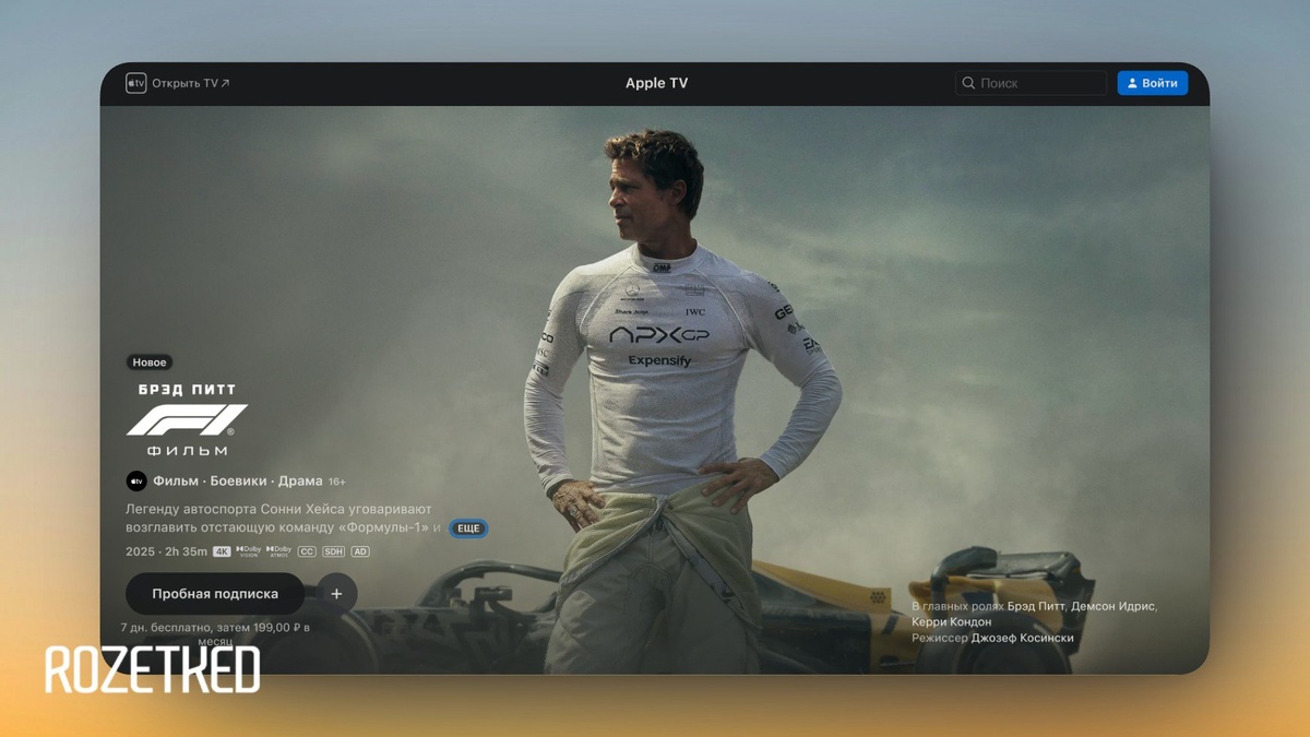 F1 с Брэдом Питтом получила полноценный русский дубляж в Apple TV Какое-то время назад Apple прекратила озвучку своих фильмов и сериалов на русском языке, и даже F1 первоначально вышла без дубляжа. Наши коллеги из издания iPhones со ссылкой на свои источники сообщили, что это не исключение, и в дальнейшем те проекты, которые уже вышли на рынок, тоже получат русский дубляж. 💼 Rozetked | Подписаться