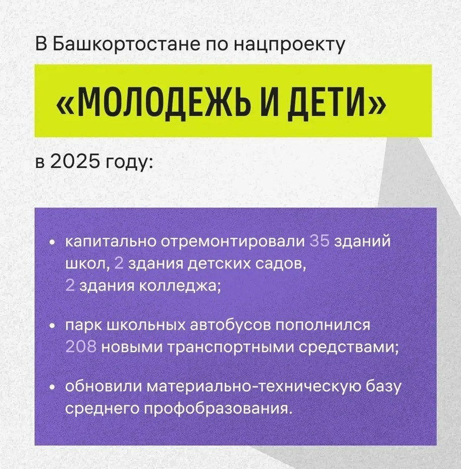 В Башкирии в 2026 году планируют провести капитальный ремонт 36 школьных зданий, шести колледжей и шести детских садов. Об этом сообщили в региональном министерстве молодёжной политики, отметив, что работы пройдут в рамках нацпроекта «Молодёжь и дети». В текущем году в республике обновили 35 школьных зданий, два детских сада и два колледжа. Кроме того, была модернизирована материально-техническая база образовательных учреждений, а школьный автопарк пополнился 208 новыми автобусами. С 2019 по 2024 год в Башкирии построили и ввели в эксплуатацию 48 школ и 65 детсадов по нацпроекту «Образование». Регион стабильно входит в число лидеров страны по темпам строительства и реконструкции образовательных объектов.