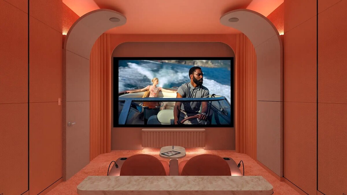 Название проекта: ВЯЗЕМКА Тип: ЧАСТНЫЙ ДОМ Место: РУБЛЁВО-УСПЕНСКОЕ ШОССЕ, МО, РОССИЯ Авторы: ARTINSTALL Статус: ПРОЕКТ Звук: 9.4.6 Этот дизайн интерьера в осовремененном стиле 60-70х годов мы создали для заказчика с домом в Подмосковье. Это первый проект персонального кинозала в этом популярном стиле. Ура, мы любим не только ар-деко! 🙂 Дизайнер заказчика предложил кинозал как раз в стиле ар-деко: вполне привлекательный и статусный, в благородных тонах. Этот дизайн был утверждён семьёй заказчика, но позже они захотели «чего-то другого» и обратились к нам за новыми свежими вариантами. Мы предложили стиль интерьера, который испанский индустриальный дизайнер Джейме Хайон назвал «цифровым средиземноморским барокко» — игривый, с плавными формами, но лаконичный и сочный по колористке. Для кинозала выделено помещение на первом этаже площадью чуть более 34 м² и высотой 3.3 метра. Акустическим каркасом мы скорректировали ломанную форму комнаты и привели её ближе к прямоугольной для улучшения а