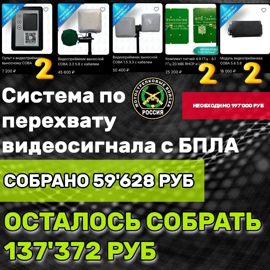 "-Парни, сбор очень медленно идет...Вы уж потерпите.. -Ничего, мы все понимаем... Столько расходов в связи с праздниками... Сбор идет и Слава Богу 🙏..." "ВОроны" ждали своей очереди год с лишним. Не подведём. Продолжаем сбор на СОВУ. 📌Сумма к сбору - 197'000 🔺Собрано - 59'628 руб. 🔺Осталось собрать - 137'372 руб. Изделие «Сова» — это не только хороший вынос видео для операторов, но и ценный перехватчик видео. Вскрывается минирование, перехватывается организация засад FPV-дронов, перехватываются «крылья» противника. Любую посильную сумму можно совершить по номеру карты 💳2202208188194204 или по номеру телефона 📞+79530562233 Получатель - Светлана Владимировна Л. ("Сбербанк"). *Оборудование будем заказывать у производителя после 100% предоплаты. Срок изготовления - 45 дней ‼️