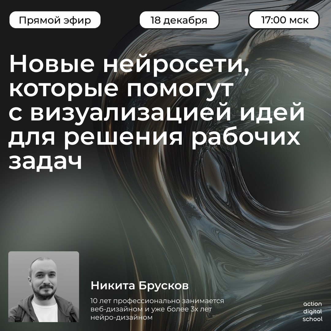 Приглашаем на бесплатный вебинар: «Как использовать нейросети для визуализации рабочих задач» 🗓 Когда: четверг, 18 декабря ⏰ Во сколько: 17:00 мск 📍 Где: онлайн Спикер: Никита Брусков, автор и преподаватель программы «Нейросети. Базовый курс» в Action Digital School, ведущий популярного YouTube-канала о нейро-дизайне. Вместе со спикером вы: 🧷 Узнаете плюсы и минусы использования нейросетей для рабочих задач 🧷 Нарисуете график к отчету, картинку для презентации, стилизуете текст, создадите логотип 🧷 Сгенерите персональную новогоднюю открытку 🧷 Научитесь делать нейрофото в новогодних образах 🎁 Новогодний спецбонус от спикера — авторский чек- лист «Как сформулировать промпт для нейросети, чтобы получить нужный результат» Зарегистрироваться на вебинар 👈