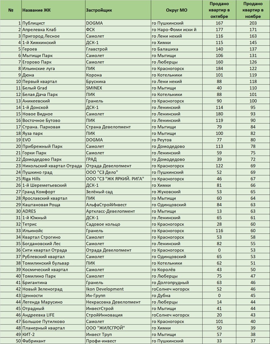 ТОП-50 самых продаваемых ЖК в Московской области за ноябрь 2025 года