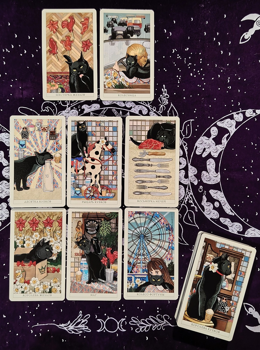 Здравствуйте дорогие подписчики и гости моего канала. Рада приветствовать вас. Напоминаю, что расклады я делаю общие и они не могут совпадать у всех на сто процентов. Давайте сегодня посмотрим, что думал о вас загаданный человек. Будет небольшая сигнификация, чтобы вы могли понять, подходит ли вам этот расклад. Он и вы сегодня : На него выпала карта шестёрка жезлов. Он сегодня счастливчик, получил хорошие новости, либо премию, либо ещё что-то очень приятное. Как тот котик на карте получил миску вкусного лосося. Человек сегодня в хорошем расположении духа, доволен собой и удовлетворён произошедшими событиями. Но может зазнаться и задрать нос от своего успеха. На вас вышла карта Колесница. Вы сегодня в движении, гармонии и радости. Возможно, поехали в гости, либо в другое приятное для вас место. Решили отдохнуть, развеяться, приятно провести время. Конец года, крупные дела удалось успешно завершить и можно посвятить время различным приятностям. Возможно, кто-то из вас отправился за
