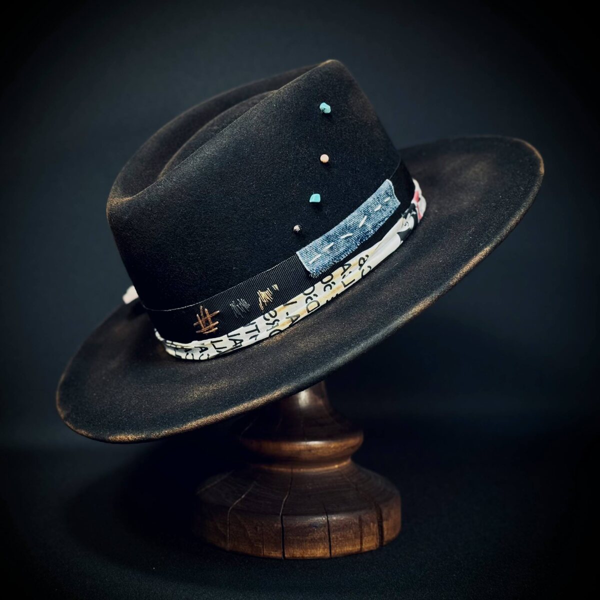 Fedora Max Stardust Чёрная федора с благородными опалинами. - Классический силуэт из чёрного фетра. - Лента из состаренного репса, поверх которого завязан белый хлопковый платок с архивными надписями. - Ручные стежки и камни: бирюза, лава, обсидиан, агат — как россыпь звёздной пыли. Каждый стежок — это фиксация мысли, а каждый камень — точка притяжения. ————————— Размерный ряд: от 52 до 64, включая промежуточные размеры (52.5, 53.5 и т.д.) Цена: 14 500 ₽ Все шляпы изготавливаются индивидуально под заказ в нашей мастерской. Заказать или просто спросить:) #fedora #max #stardust #черный #7см