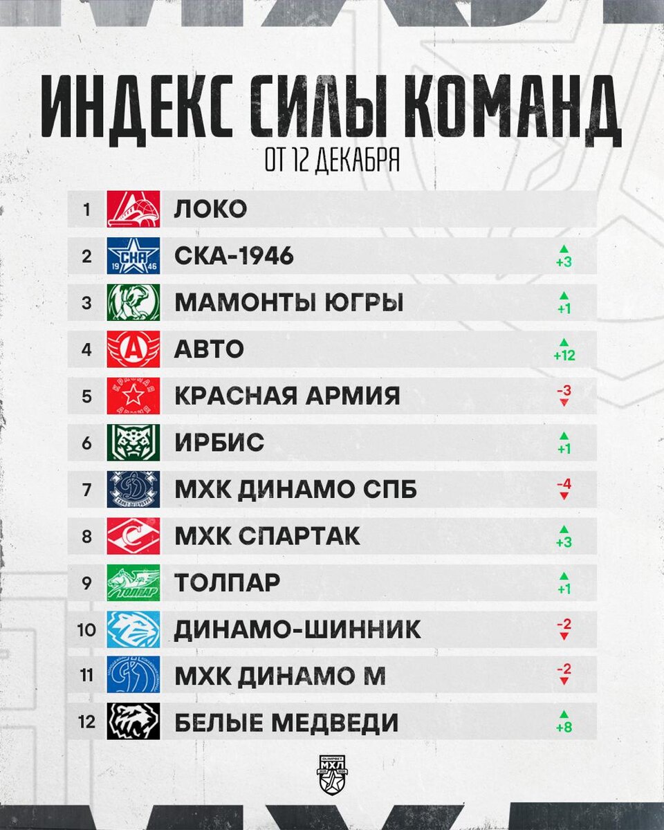 Обновления в Индексе силы — «Авто»🚗 показывает рост на 12 пунктов, «Белые Медведи»🐻❄️ — на восемь 👀 *Индекс силы — это рейтинг, который показывает, какие команды сейчас в форме и обыгрывают фаворитов. Все команды начинают регулярный чемпионат с одинаковым количеством баллов. За победу в основное время у команды отнимают 25% баллов соперника, за победу в овертайме или в серии бросков — 12,5%. 🏒@mhlrus