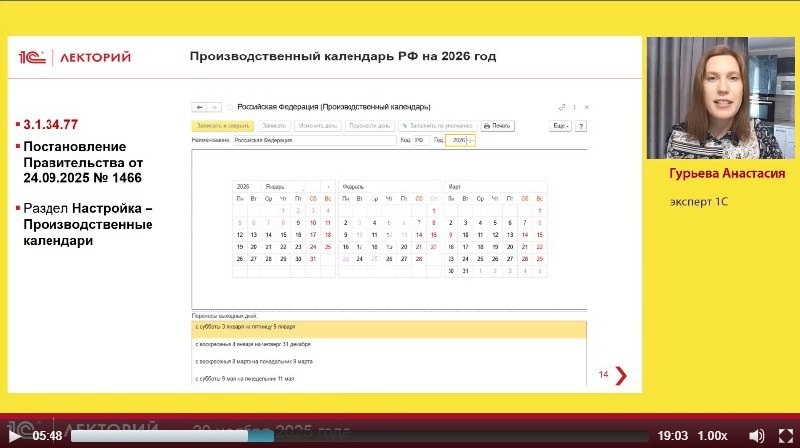 ‼️Про производственный календарь РФ на 2026 год рассказала Анастасия Гурьева, эксперт 1С в лекции на тему Новое в программе 1С:ЗУП ред. 3, начиная с версии 3.1.34.77 *️⃣ Дополнительно доступна презентация лектора 👉 Смотрите бесплатно полную видеозапись лекции 🚨Подписывайтесь на @lector_1c