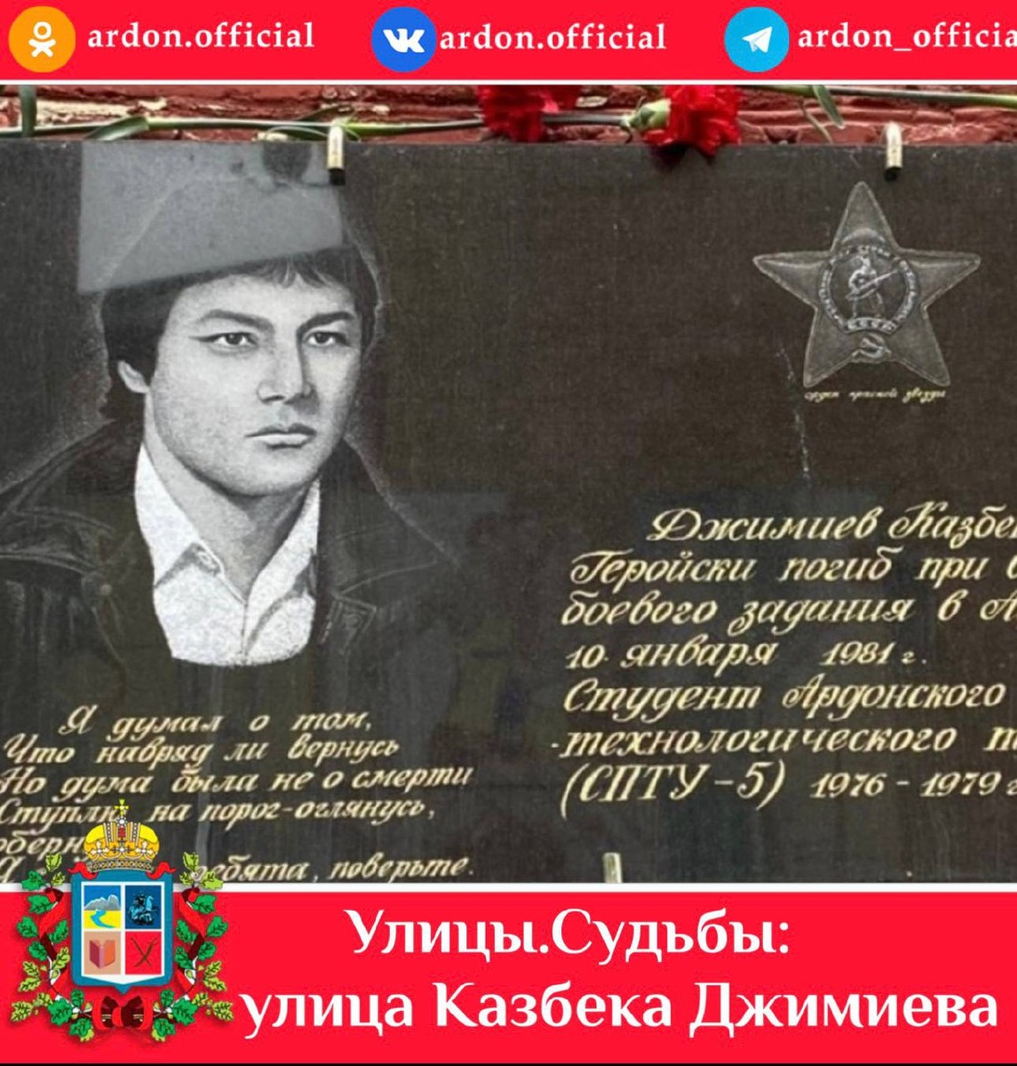 «Улицы.Судьбы: Истории людей, чьи имена увековечены на улицах, площадях и скверах города Ардона». 📍Улица Казбека Джимиева В Осетии всегда с особым уважением относились к защитникам Отечества, глубоко почитая ратный труд тех, кто в мирное и военное время с оружием в руках охранял мир и спокойствие нашего народа. Казбек Джимиев родился 17 мая 1960 г. в городе Термезе Узбекской ССР, куда ранее из Осетии переехала его семья в поиске заработка. Его родители, Майрам и Вера, были очень рады этому событию, т. к. долгие годы у них не было детей. Вскоре семья вернулась в Осетию, в Ардон. В Вооруженные Силы СССР Казбек был призван 5 мая 1979 г. и уже в феврале 1980 г., после того, как на нашей территории его подготовили в учебном батальоне на механика БМП, в составе наших войск был направлен в Афганистан. В мотострелковом полку Казбек Джимиев был отличным водителем-механиком, бесстрашным, смелым и надёжным товарищем, участвовал в нескольких боях. На все важные задания, в боевые рейды команди