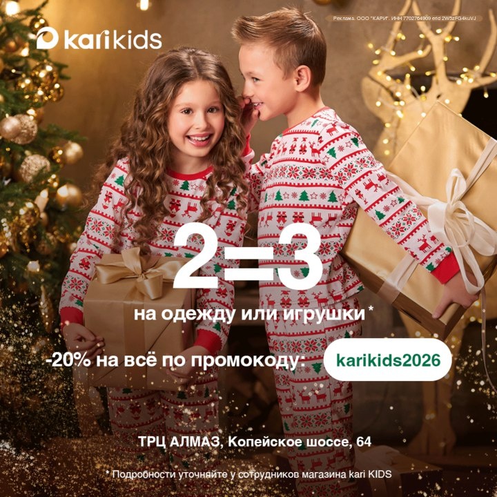 Эксклюзив для подписчиков нашего сообщества от бренда Kari KIDS! 🌟 Промокод karikids26 дает скидку -20% на все детские товары, в том числе: • игрушки; • карнавальные костюмы; • нарядную одежду; • праздничные туфли; • детскую косметику; • и многое другое для мальчиков и девочек. Промокодом можно воспользоваться несколько раз весь декабрь и январь. Действует при оформлении заказа онлайн и на кассе в самом магазине. Отличная возможность в преддверии Нового года — используйте сами и поделитесь с близкими! 🎄