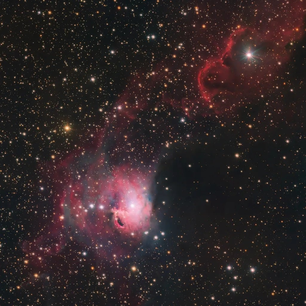 Прекрасная туманность Гам 3, расположенная примерно в 3600 световых годах от нас, излучает водород в красном и розовом цветах, а пыль отражает синий свет от звезд.