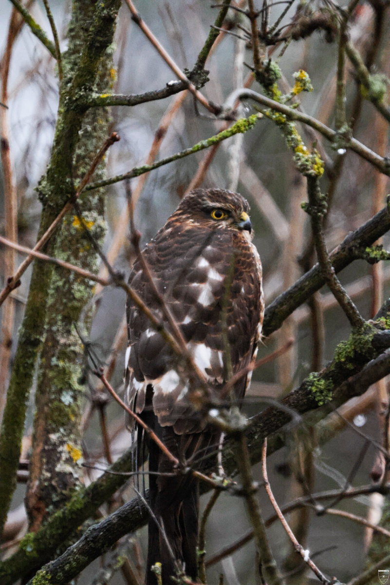Ястреб-перепелятник (малый ястреб)! На фото красуется самка ястреба - перепелятника! Размеры и половой деформизм: самки значительно крупнее самцов (длина тела 35-41 см против 29-34 см). Вес самок 185-350 г, самцов - 100-200 г. Это одна из самых больших разниц между полами среди птиц. Окрас: самки и молодые птицы сверху буровато-серые, снизу - с бурым рисунком. У всех характерные белые полосы ("брови") над глазами. Тактика: ястреб - перепелятник - мастер скрытного нападения из засады. Ловит добычу в стремительном броске, низко над землей, лавируя между деревьями и кустами. Зимовка: часть птиц, особенно взрослые самцы, остаётся зимовать в области, концентрируясь у населённых пунктов, где есть кормовая база (воробьиные стаи). Основная популяция улетает на зимовку в Центральную и Южную Европу. Питание: рацион различается у самцов и самок из-за разницы в размерах. Самцы чаще охотятся на мелких птиц: синиц, воробьёв, зябликов и пеночек. Самки способны добывать дроздов, ск