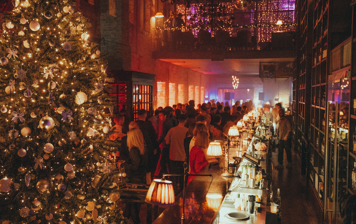 Цена — 20 000 ₽. Меню от шефа Артёма Сипугина: икра, эклеры с паштетом, утка, легендарный оливье. Вечер начинается в 21:00 с ностальгических фильмов, джаз-бэнда «Знакомый мотив» и подарков под ёлкой. После боя курантов — диджей-сет, горячий пунш и шуточные розыгрыши. Праздник длится до 4–5 утра.