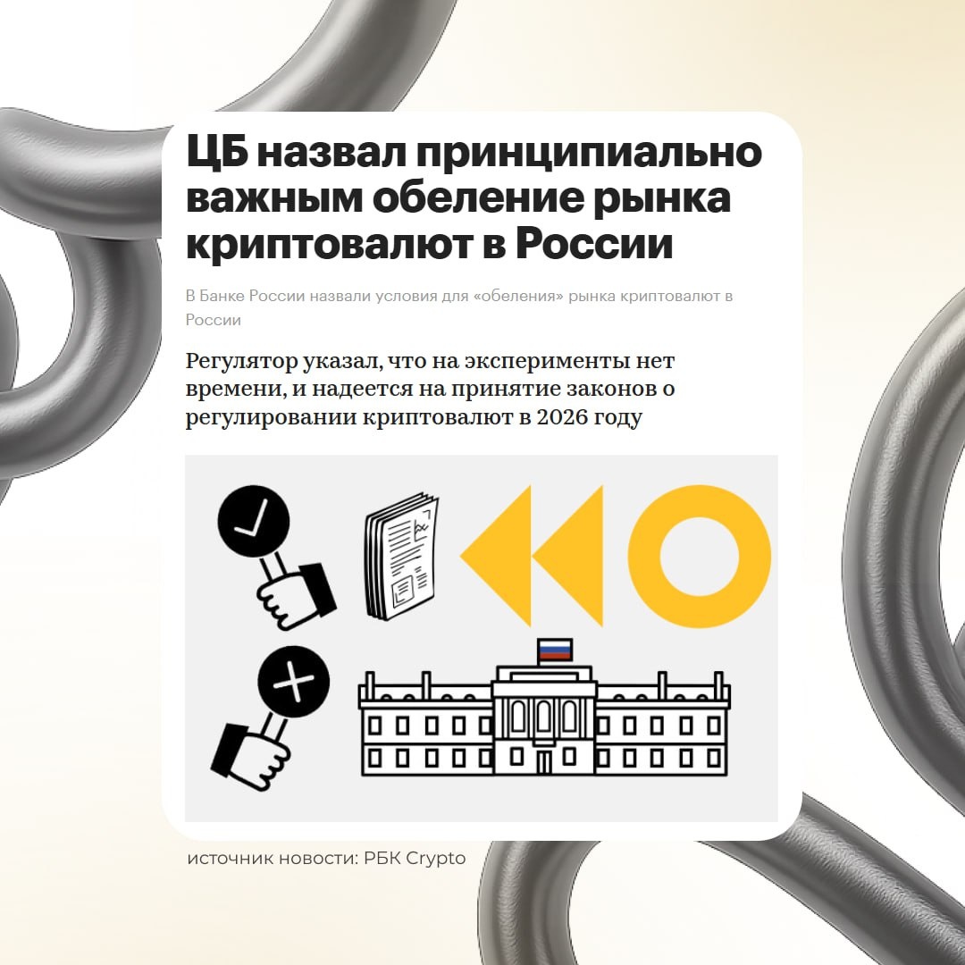 Центробанк официально обозначил курс на жёсткое, но понятное регулирование крипторынка в России Мы считаем, что эта новость — не про «закручивания гаек ради запрета», а про переход к понятным правилам игры ЦБ фактически говорит следующее: • крипта в России не исчезает, • но работать с ней можно будет только в прозрачном, лицензированном контуре, • у рынка есть несколько лет, чтобы уйти из «серой зоны» в полностью формализованный режим По срокам: • закон выйдет ориентировочно в 2026 году, • ответственность за нелегальные схемы — с 2027-го
