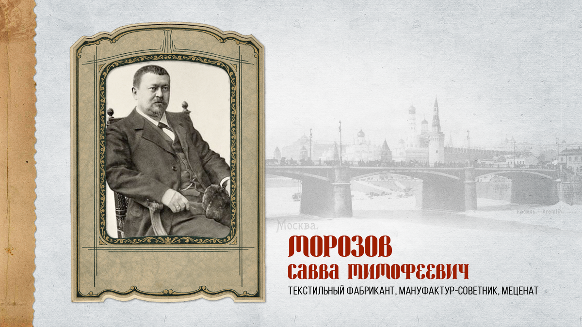 Савва Тимофеевич Морозов (1862–1905) был крупным поставщиком тканей на рынки Москвы и всей Центральной России, а также одним из самых влиятельных предпринимателей своего времени. Фабрикант происходил из старообрядческого купеческого рода Патриаршины (ныне — Орехово-Зуево), основателем которого стал дед Саввы Тимофеевича — крепостной крестьянин Савва Васильевич Морозов. Он устроился ткачом в шелкоткацкую мануфактуру, затем организовал собственную мастерскую и смог выкупить на волю себя и пятерых сыновей. За 30 лет плодотворной работы ему удалось накопить многомиллионный капитал и открыть несколько мануфактур, оставив потомкам внушительное наследство.