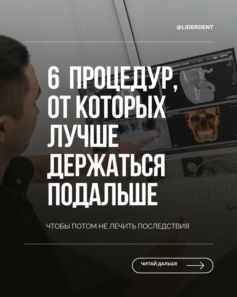 6 стоматологических решений, которые чаще всего приходится переделывать Выглядят безобидно. Иногда даже «выгодно». Но именно они чаще всего заканчиваются болью, переделками и длительным лечением. Почему так происходит? Потому что делают не по плану, а «по запросу здесь и сейчас». Вот с чем мы чаще всего сталкиваемся на диагностике: — «быстрое» отбеливание агрессивными составами — виниры без учёта прикуса — дешёвые коронки «как везде» — пломбы поверх недолеченных проблем — удаление зубов без плана восстановления — капы из интернета Важно понимать: опасна не сама процедура. Опасно, когда её делают без диагностики, анализа нагрузки и понимания последствий. В ЛИДЕР ДЕНТ мы всегда начинаем с главного - точного разбора ситуации, а не быстрых решений. Если хотите понять, что на самом деле происходит с вашими зубами и какие шаги будут правильными именно для вас, запишитесь на диагностику