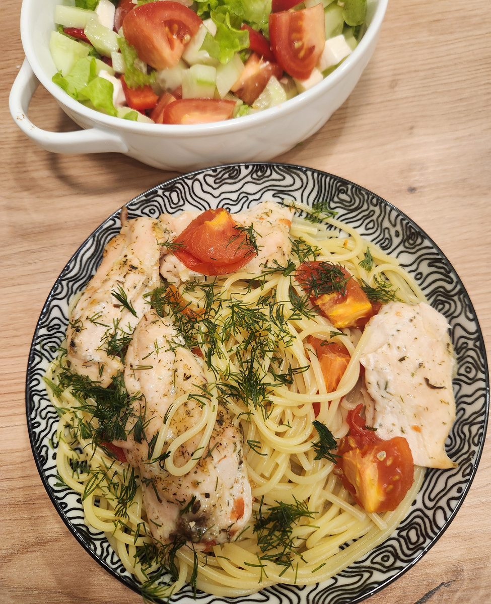 Очередная подборка блюд из куриной грудки. Другие рецепты с грудкой можно посмотреть здесь: 1. Запечённое куриное филе со спагетти Ингредиенты на 4 порции: 2 крупных куриных филе, 4 помидора, 2 ч. л. смеси сушёных итальянских трав, 300 г спагетти, 2 ч. л. оливкового масла, зелёный лук, укроп, соль, чёрный молотый перец Филе грудки вымыть, разделить каждое на две части. Слегка отбить. Посыпать травами, посолить и поперчить. Уложить в форму для запекания. Помидоры вымыть, обсушить и разрезать на четвертинки. Уложить в форму рядом с куриным филе. Полить всё оливковым маслом, прикрыть фольгой и запекать около 20 минут. Затем снять фольгу и запекать ещё 5-7 минут. Спагетти варить в кипящей подсоленной воде 10 минут и откинуть на дуршлаг. Укроп и зелёный лук вымыть и хорошо обсушить, после нарезать. Горячие спагетти подать на стол с запечённым филе, посыпать сверху зеленью. 2. Куриное филе со овощами Ингредиенты на 4 порции: 2 крупных куриных филе, 1 цукини, 4 помидора, 1 листовой салат в